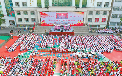 国庆假期,湖北省南漳县实验中学师生齐唱红歌。 |
