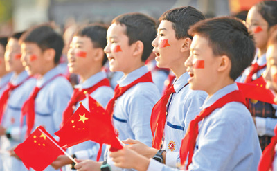 国庆假期,重庆市北碚区的小学生们高唱《歌唱祖国》。 |