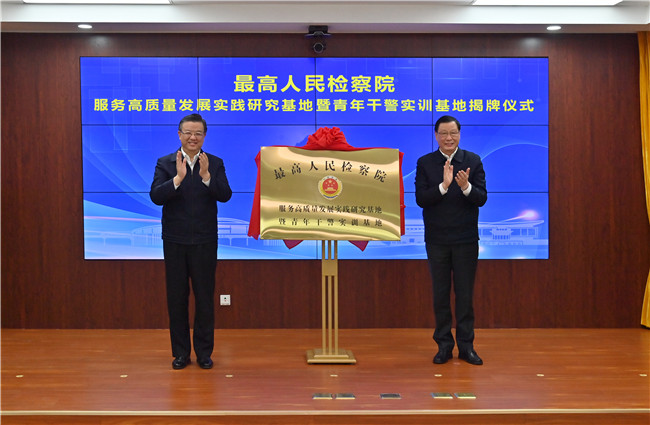 2月2日,最高人民检察院党组副书记、副检察长应勇与河北省委书记、省人大常委会主任倪岳峰共同为“最高检服务高质量发展实践研究基地暨青年干警实训基地”揭牌。