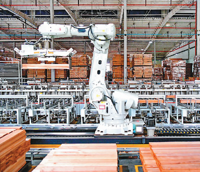 江西省赣州市南康区出台数字化转型奖励扶持政策,在技术攻坚、资金奖补、创新研发方面,激励引导家具生产企业利用数字化工具、工业互联网、产业大数据平台提升生产效率,降低生产综合成本,不断激发企业数字化转型发展潜能。图为在南康区的一家品牌木地板上市企业智能车间,码垛机械臂快速运转。 |