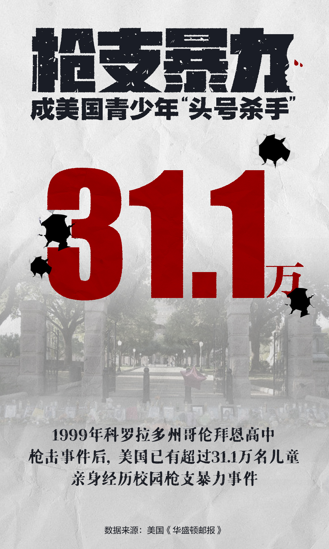据《华盛顿邮报》调查显示,1999年科罗拉多州哥伦拜恩高中枪击事件后,美国已有超过31.1万名儿童曾亲历校园枪支暴力事件。由于枪支泛滥,部分美国青少年甚至走上歧途,反而成为涉枪伤害事件的加害者。