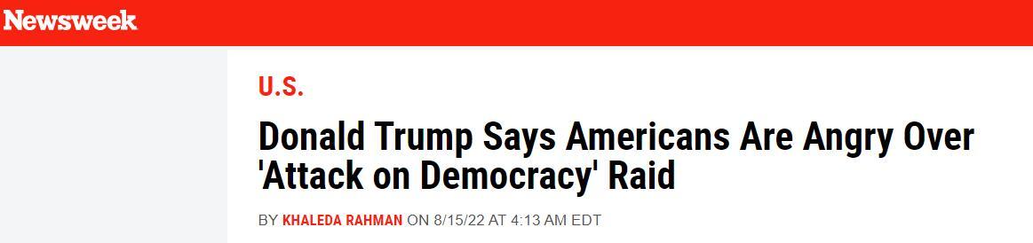 美国前总统特朗普对联邦调查局(FBI)搜查他的海湖庄园持续表达愤怒,据美国《新闻周刊》报道,特朗普于当地时间14日晚再次发声谴责称,FBI搜查他的家“如同对民主的偷袭”,是“完全闻所未闻和难以想象的”,并宣称整个国家都对此感到“愤怒”。