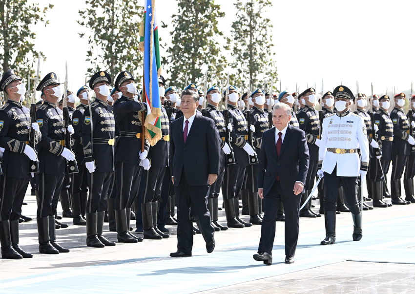 当地时间9月15日,国家主席习近平在撒马尔罕同乌兹别克斯坦总统米尔济约耶夫会谈。会谈前,米尔济约耶夫为习近平举行隆重欢迎仪式。新华社记者 申宏 摄