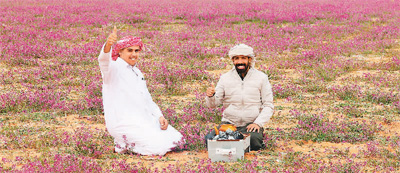 近日,在沙特阿拉伯拉夫哈,人们在薰衣草田中煮茶休闲。新华社/法新