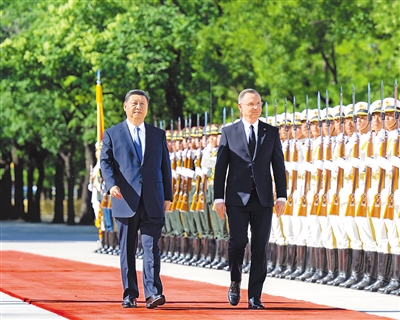 6月24日下午,国家主席习近平在北京人民大会堂同来华进行国事访问的波兰总统杜达举行会谈。这是会谈前,习近平在人民大会堂东门外广场为杜达举行欢迎仪式。 |