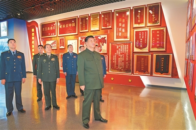 随后,习近平参观了空降兵军军史馆。该军是一支历史厚重、功勋卓著的英雄部队,革命战争年代历经战火硝烟洗礼,抗美援朝战争上甘岭战役中打出了国威军威,和平建设时期出色完成一系列重大任务,涌现出一大批英雄集体和英模人物。习近平仔细观看展陈,认真听取讲解。他叮嘱大家,要用好红色资源优势,教育引导官兵把光荣传统弘扬好,争做新时代英雄传人。