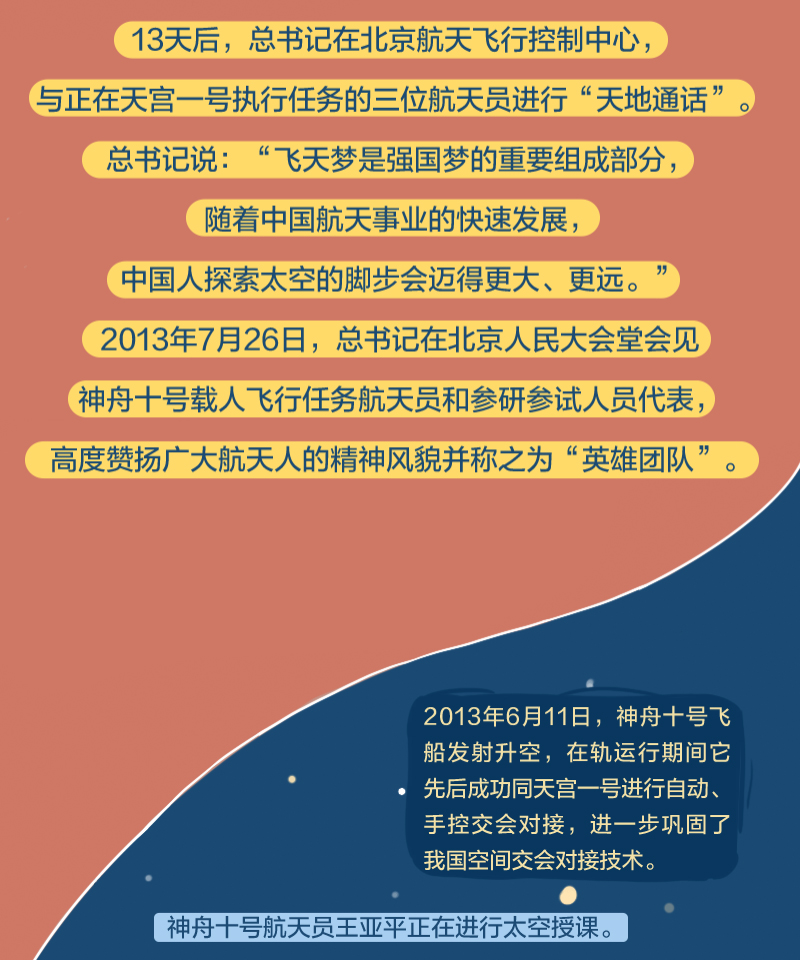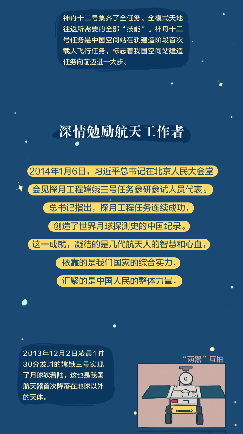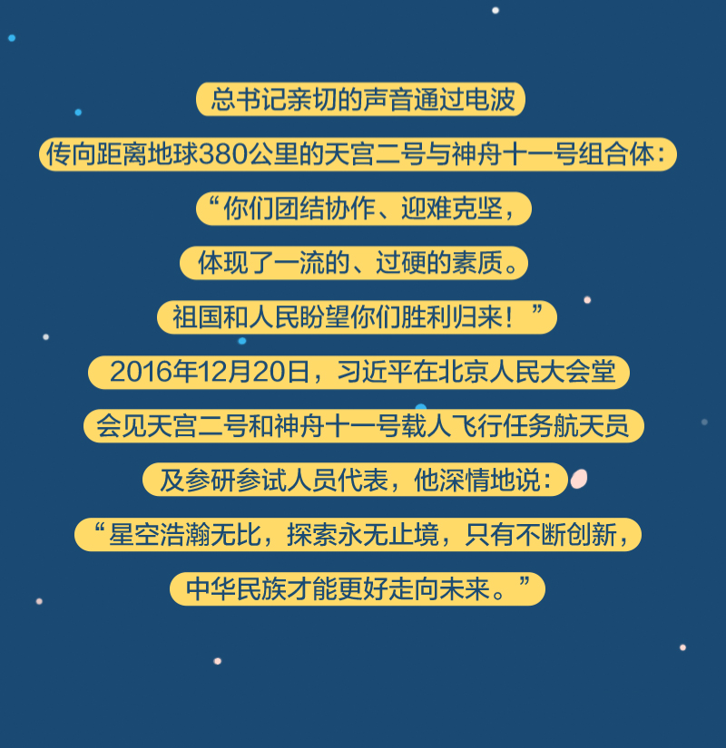 党的十八大以来,总书记始终高度关注我国航天事业发展,多次同执行任务的航天员展开“天地通话”、给参与“东方红一号”任务的老科学家回信、亲切接见航天工作者、深情寄语航天人……
