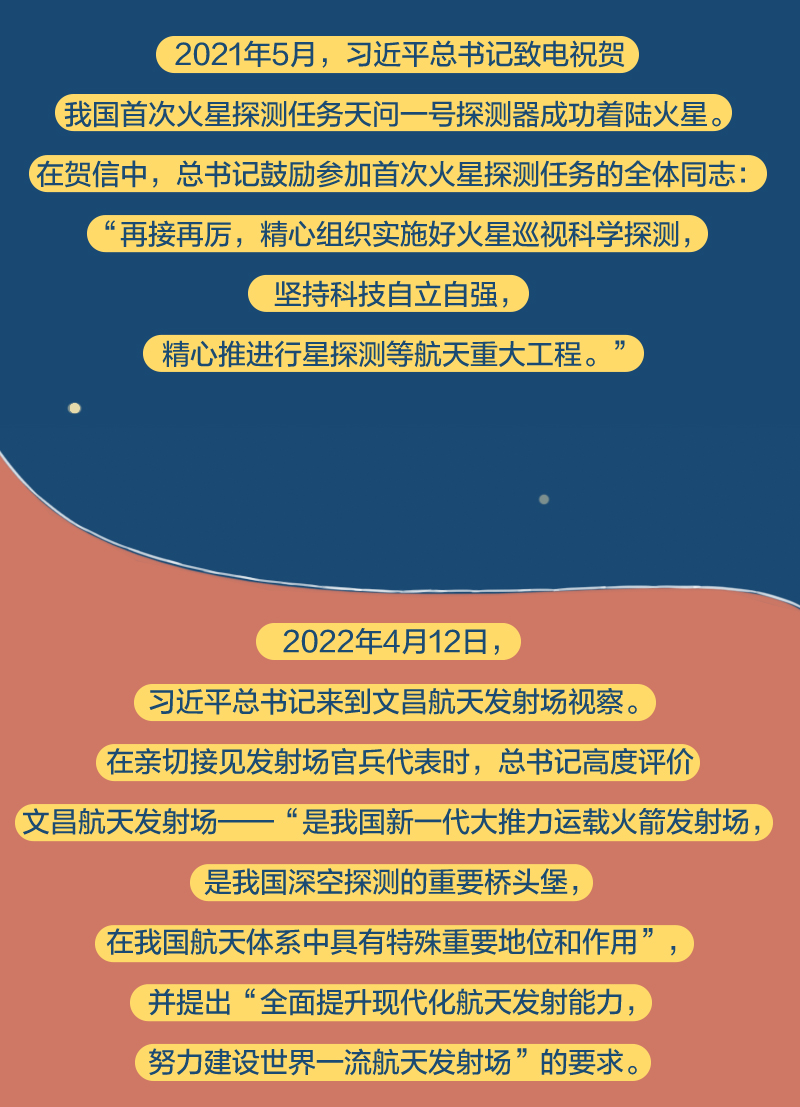 听取汇报、察看发射塔架等设施设备、到航天器总装测试厂房等详细了解有关任务准备情况……总书记肯定了文昌航天发射场成立以来出色完成各项发射任务,并在接见发射场官兵代表时,要求“全面提升现代化航天发射能力,努力建设世界一流航天发射场”。
