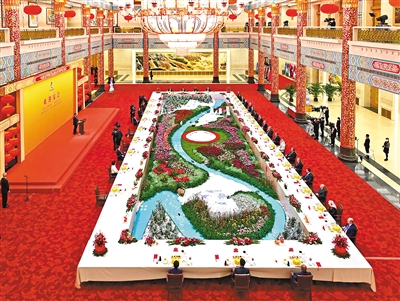 宴会在喜庆欢乐祥和的气氛中进行。结束时,习近平和彭丽媛同国际贵宾们在《一起向未来》的乐曲声中挥手道别。